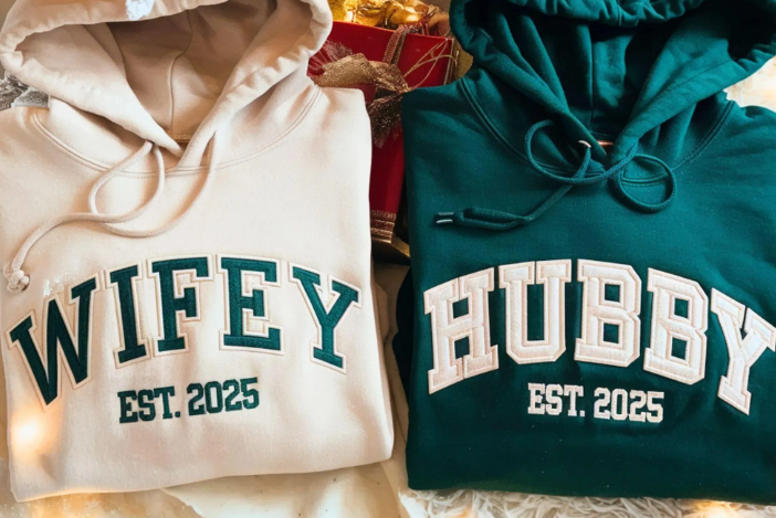 This custom couple hoodie boasts elegant appliqué "Wifey and Hubb" lettering, plus your personalized "EST." milestone year (e.g., 2025). Cozy, charming, and made to show off your bond.