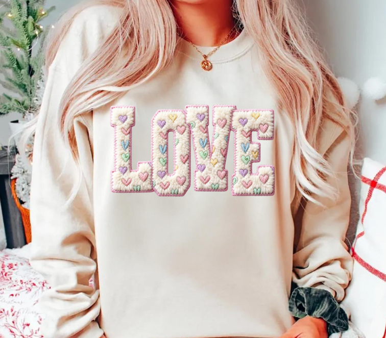Retro Faux Wool Crochet Wool Heart-Shaped Valentine's Day Print Sweatshirt
